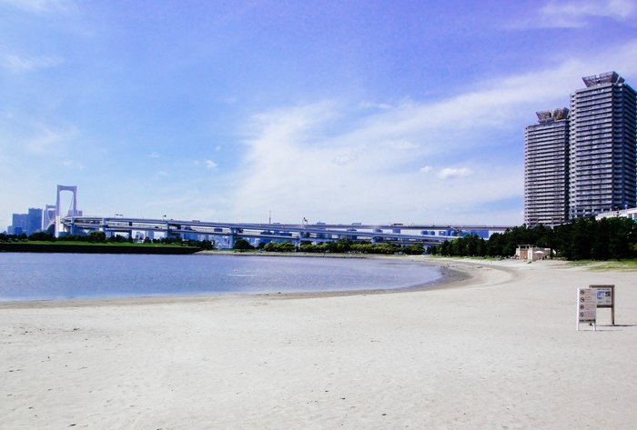 Odaiba có một bãi biển nhân tạo dài 800m nằm gần trung tâm mua sắm Decks với các tiện nghi công cộng như phòng tắm, toilet. Du khách đến đây không thể bơi lội mà hầu hết mọi người tới đây để tận hưởng ánh nắng mặt trời và tham gia các hoạt động như bóng chuyền. Từ bãi biển, bạn có thể chiêm ngưỡng được cầu Rainbow và các tòa nhà cao chọc trời của Tokyo. Vì thế, đây cũng là một điểm đến tuyệt vời để ngắm hoàng hôn.
